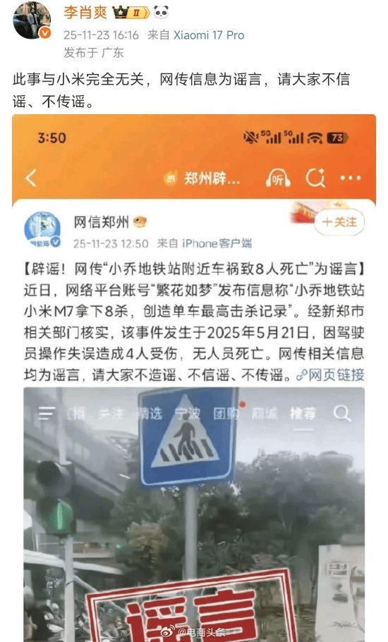 11月23日晚,小米汽车副总裁李肖爽发文示意,网传“小乔地铁站相近车祸致8人升天”一事与小米全体无闭,网传音信为谣言,请行家不信谣、不传谣。